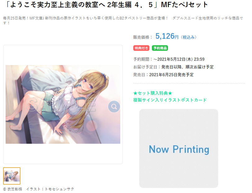 무엇보다 일본은 이런 편을 그냥 발매하지 않고 항상 특별 일러스트가 수록된 태피스트리 한정판을 발매하는 경우가 잦다. 오는 6월을 맞아 발매될 라이트 노벨 <어서 오세요 실력 지상주의 교실에 2학년 편 4.5권>에서는 카루이자와 케이의 일러스트가 그려져 있는 태피스트리 한정판 세트가 지난 5월 12일까지 예약 주문을 받았다.