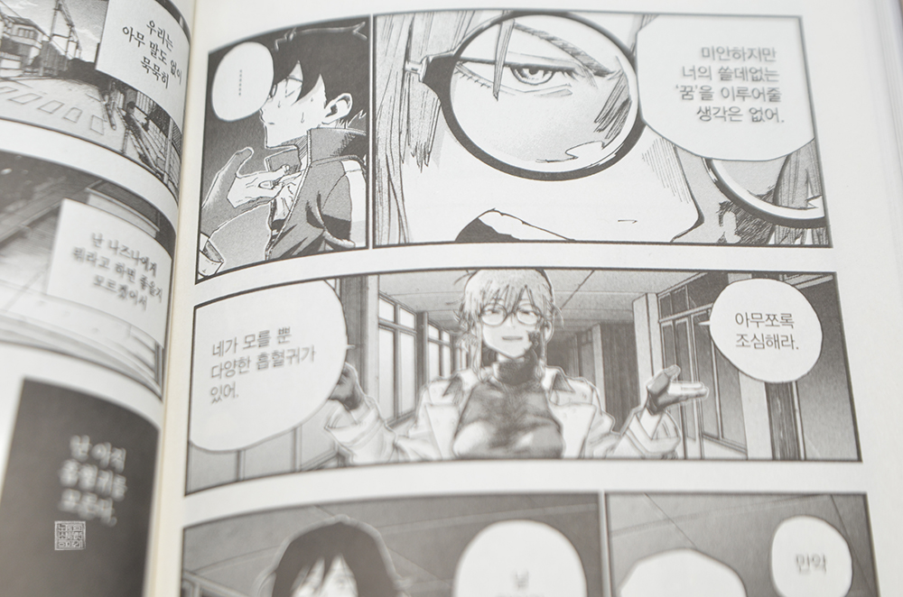 그렇다고 해서 '흡혈귀'가 등장하는 만큼 판타지 요소가 완전히 빠지면 아쉽기 마련이다. 만화 <철야의 노래 3권>에서 나즈나 외의 흡혈귀가 등장했고, 이번 만화 <철야의 노래 4권>에서는 다른 곳에 존재하는 흡혈귀와 함께 흡혈귀를 찾아 퇴치(?) 비슷한 일을 하는 사립 탐정도 등장하면서 향후 에피소드에 흥미를 품을 수 있도록 해주었다.