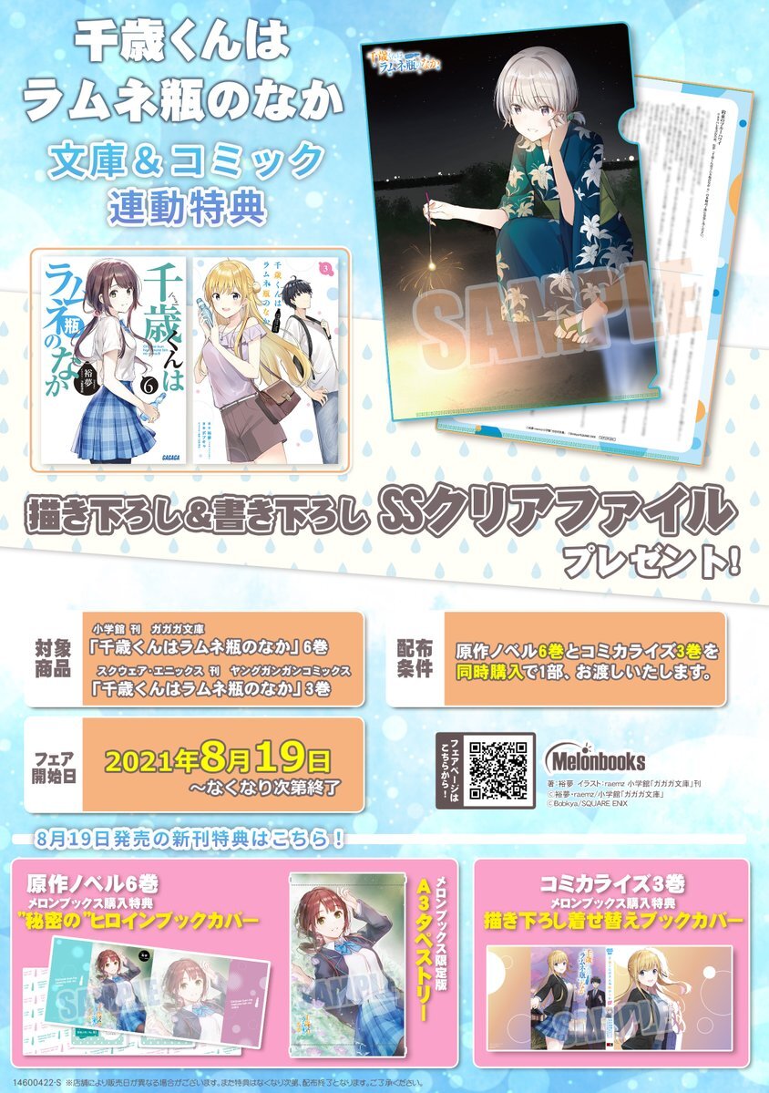 만약 멜론북스에서 라이트 노벨 <치토세 군은 라무네 병 속에 6권>과 만화 <치토세 군은 라무네 병 속에 3권> 합본 세트를 구매한다면 히로인 우치다 유아의 매력적인 일러스트가 그려져 있는 A3 태피스트리와 함께 비밀 히로인 표지를 함께 받아볼 수 있다. 당연히 만화도 특별 이중 표지를 함께 받아볼 수 있다고 한다.