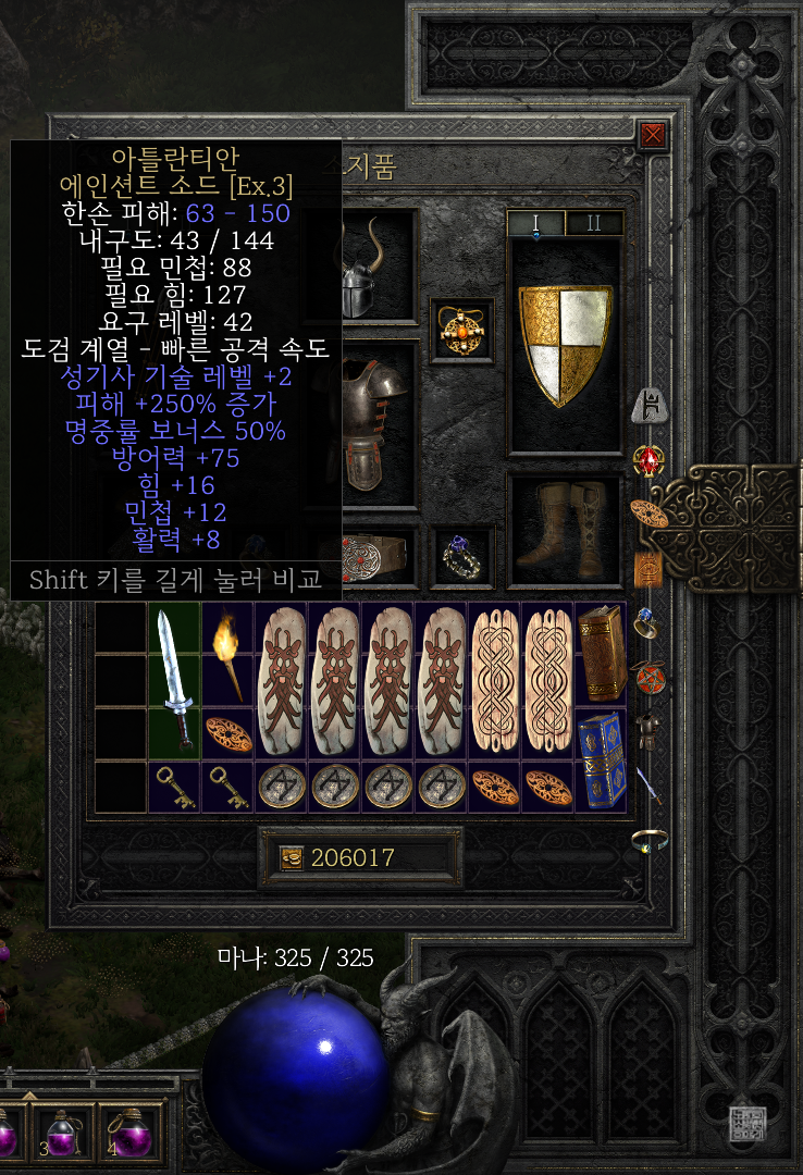 아마존으로 헬 카우방을 돌면서 획득한 아틀란티안 에이션트 소드는 성기사 기술 레벨 +2와 함께 피해 +250%, 명중률 보너스 50%가 붙어 있어서 상당히 준수한 아이템으로 보인다. 하지만 요구 레벨이 42에 필요 힘이 127, 밀요 민첩이 88에 달해 레벨 42까지 올릴 수 있는 스탯을 다 찍어도 솔직히 착용하기가 어렵지 않을까 싶다.