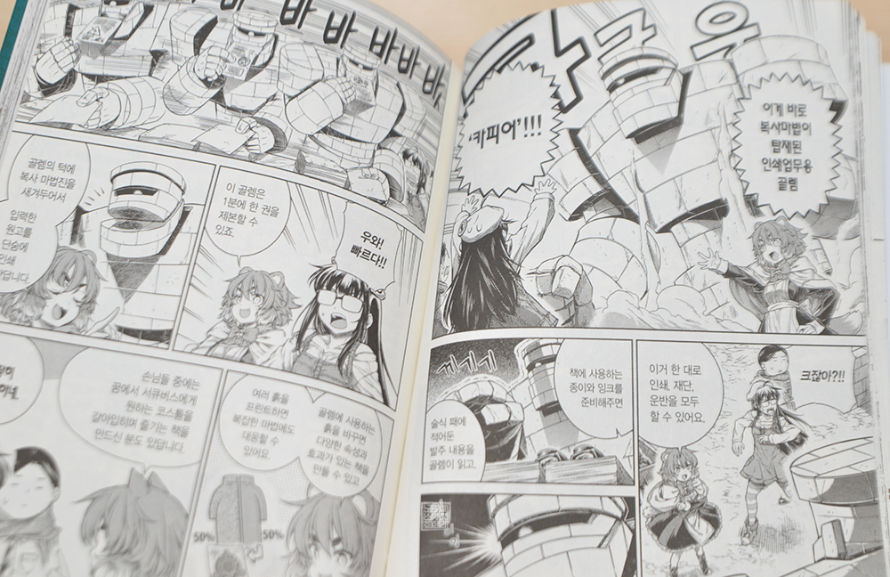 만화 <마법사의 인쇄소 5권>의 두 번째 에피소드는 주인공이 운영하는 인쇄소만 아니라 매직 마켓의 영향으로 다양한 이세계에 생겨 나기 시작한 다양한 인쇄소를 그리고 있다. 그중 하나가 위 사진에서 볼 수 있는 복사 마법이 탑재된 인쇄 업무용 골렘 통칭 '카피어'를 활용해서 1분에 책 한 권을 제본하는 골렘 인쇄소였다.