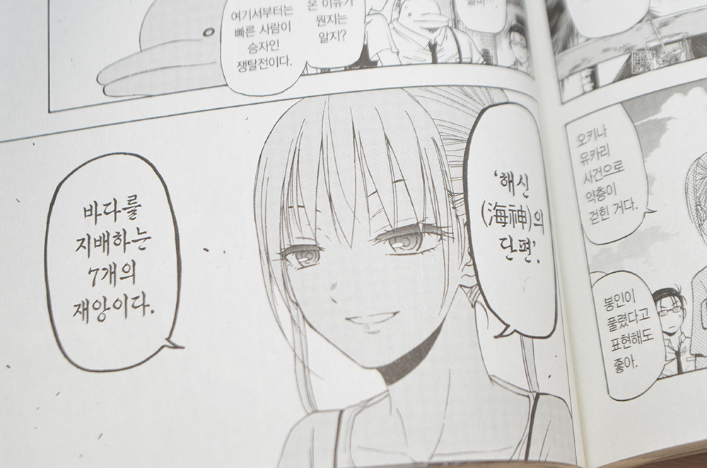 아무래도 그녀 또한 몸에 일부가 해양 생물의 능력을 갖추고 있기에 바닷속에서 자유자재로 움직이며 특수한 기술을 사용할 수 있었던 것 같다. 뭐, 어디까지 만화 <작열의 니라이 카나이 3권>에서 읽을 수 있는 단편적인 복선을 이어 본다면 그런 느낌이기 때문에 그녀가 가진 능력의 정확한 비밀은 <작열의 니라이 카나이 4권>을 읽어봐야 할 것 같다.