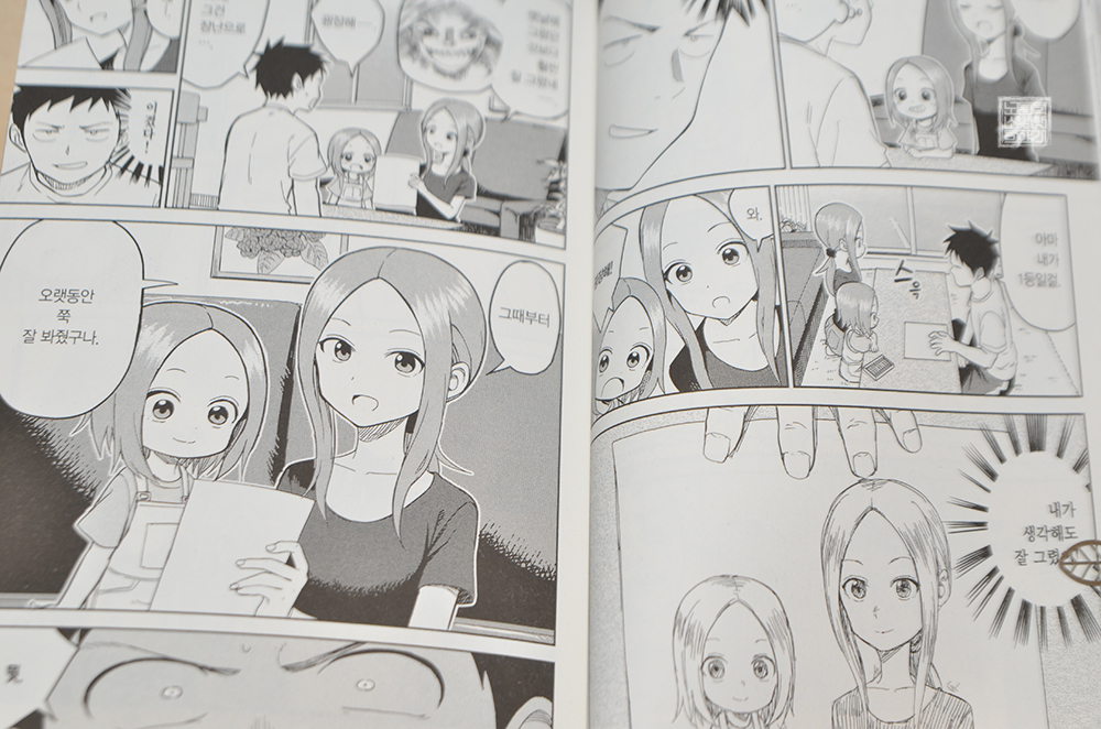 치이가 어리광을 부리지 않게 되자 살짝 어깨가 쳐진 니시카타를 보면서 타카기가 "그럼 내가 앉아야지."라면서 치이를 놀리는 동시에 니시카타를 놀린다. 세 사람이 그리는 달달하고 행복한 모습을 보면서 얼마나 웃었는지 모른다. 기분 좋게 웃을 수 있는 일이 다소 없을 때는 역시 <장난을 잘 치는 전 타카기 양> 같은 만화가 필요한 것 같다.