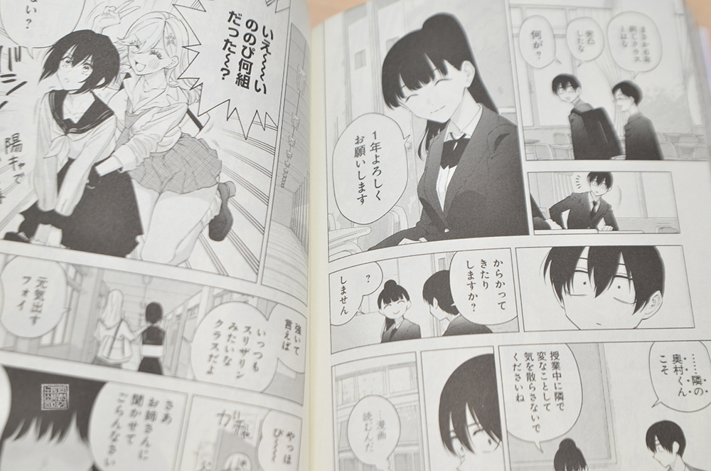그렇게 주인공 오쿠무라의 성장이 그려진 만화 <2.5차원의 유혹 14권>은 마리나의 졸업식을 겪으면서 본격적으로 새 학기에 들어가게 된다. 새 학기 첫날은 역시 코스프레 만화의 왕도답게 부실에서 오쿠무라가 리리사와 단둘이서 촬영을 하며 두근거리는 모습이 그려졌고, 새롭게 클래스메이트가 된 회장 타키는 오쿠무라의 옆자리가 되었다.