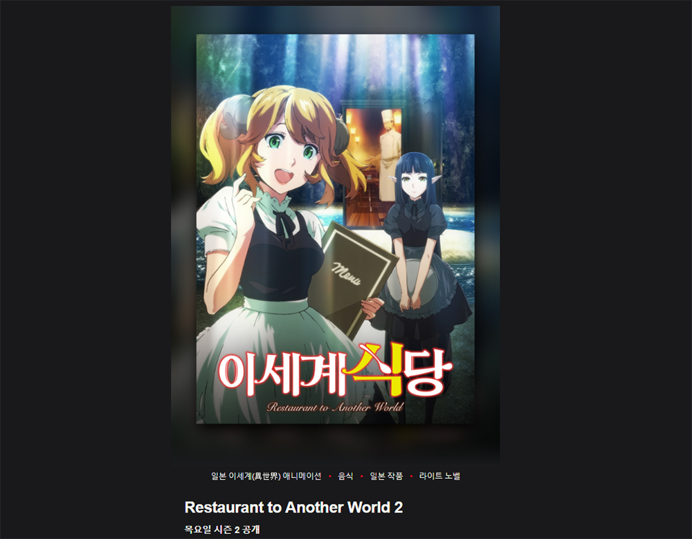 넷플릭스에서 오는 9월 1일(목)을 맞아 애니메이션 <이세계 식당 2기>를 공개한다고 한다. 그동안 넷플릭스는 꾸준히 여러 애니메이션을 공개하고 있지만, 애니메이션 방영 시즌과 함께 공개를 하기보다 조금 시간이 지난 후에 공개하는 경우가 많았다. 그래서 애니메이션을 시청하는 사람들은 대체로 라프텔을 구독하고 있었다.
