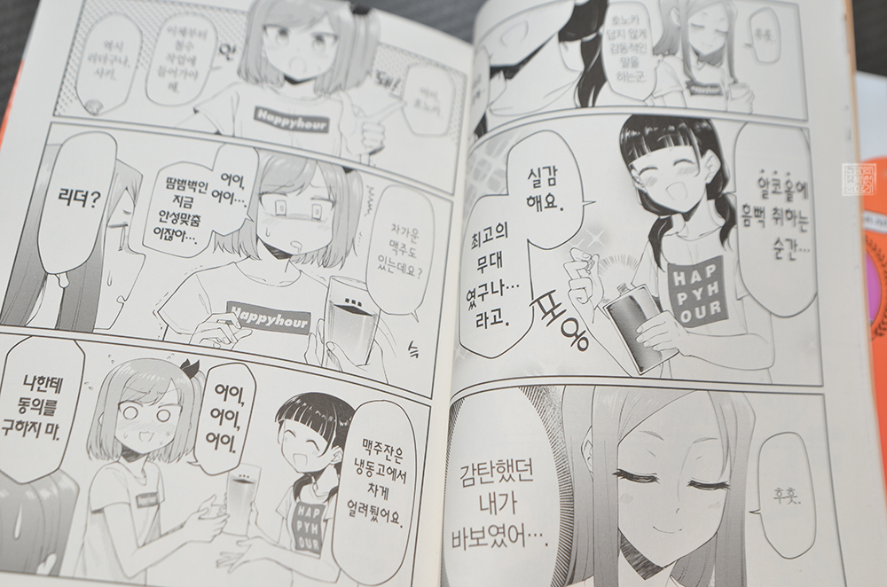 현실이라면 자칫 사고가 날 수도 있는 법이지만, 만화이기에 그런 일 없이 술을 즐기면서 사키와 호노카를 중심으로 모인 사람들이 함께 소소한 시간을 보내는 모습을 감상할 수 있다. 오랜만에 발매된 만화 <아이돌 드렁크 3권>도 딱 그런 분위기로 그려진 이야기가 다채롭게 수록되어 있어 만화를 읽는 내내 웃으면서 페이지를 넘길 수 있었다.