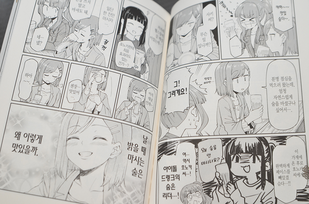 현실이라면 자칫 사고가 날 수도 있는 법이지만, 만화이기에 그런 일 없이 술을 즐기면서 사키와 호노카를 중심으로 모인 사람들이 함께 소소한 시간을 보내는 모습을 감상할 수 있다. 오랜만에 발매된 만화 <아이돌 드렁크 3권>도 딱 그런 분위기로 그려진 이야기가 다채롭게 수록되어 있어 만화를 읽는 내내 웃으면서 페이지를 넘길 수 있었다.