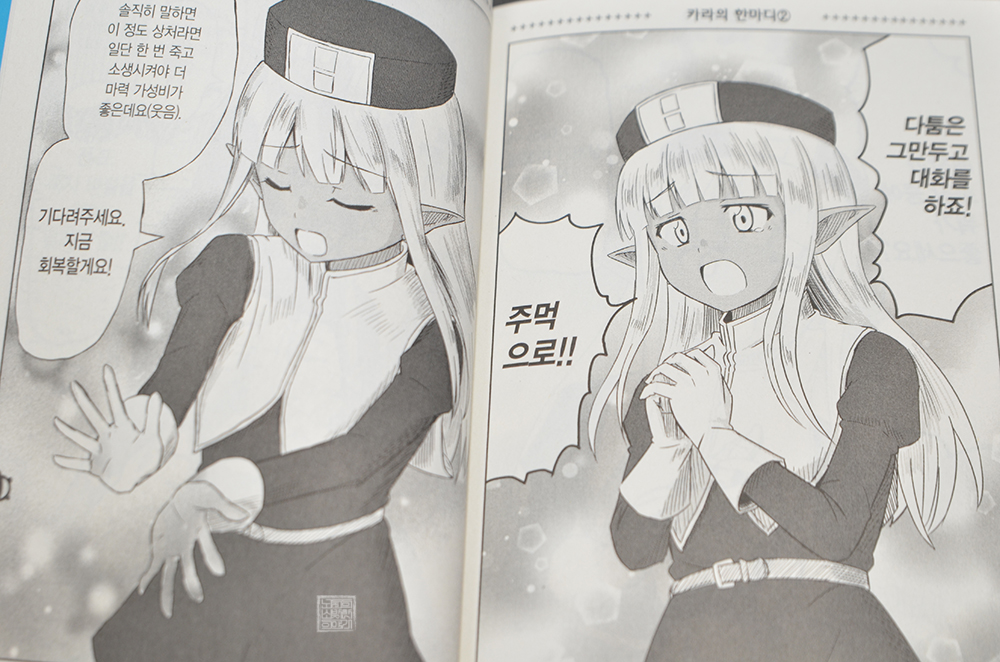 그리고 만화 <이 힐러 귀찮아 5권> 후기를 마치면서 마지막 페이지에 수록된 '카라의 한마디'에서 읽어볼 수 있는 한 장면을 사진으로 첨부한다. 만화 <이 힐러 귀찮아> 시리즈는 표지를 벗기면 볼 수 있는 책에 그려진 일러스트를 감상하는 재미와 본편을 다 읽은 이후 읽어볼 수 있는 한 페이지 일러스트도 감상하는 재미가 쏠쏠하니 놓치지 말자!