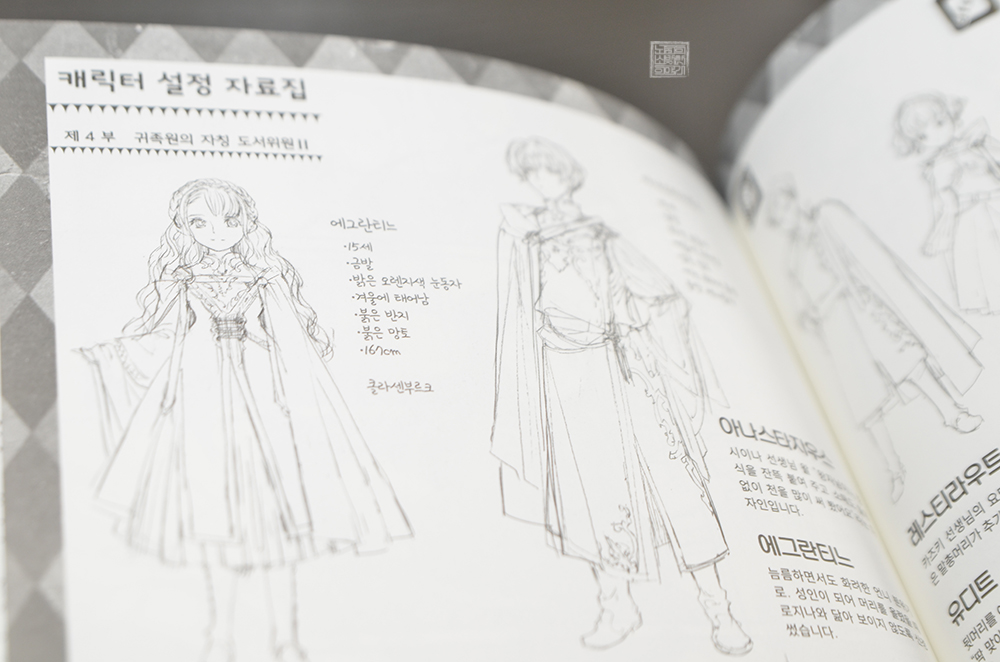 지난 <책벌레의 하극상 오피셜 팬북 2권>에서는 각 점포 특전과 여러 쇼트 스토리를 풍부하게 읽어볼 수 있어서 좋았는데, 이번 <책벌레의 하극상 오피셜 팬북 3권>에서는 쇼트 스토리가 딱 한 편만 실려 있어서 다소 아쉬웠다. 팬북 3권은 쇼트 스토리 대신 책에 수록된 권두 컬러 일러스트와 함께 러프, 캐릭터 설정 자료집이 무척 풍부했다.