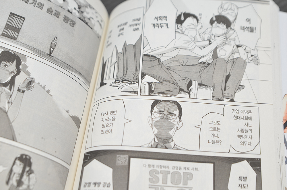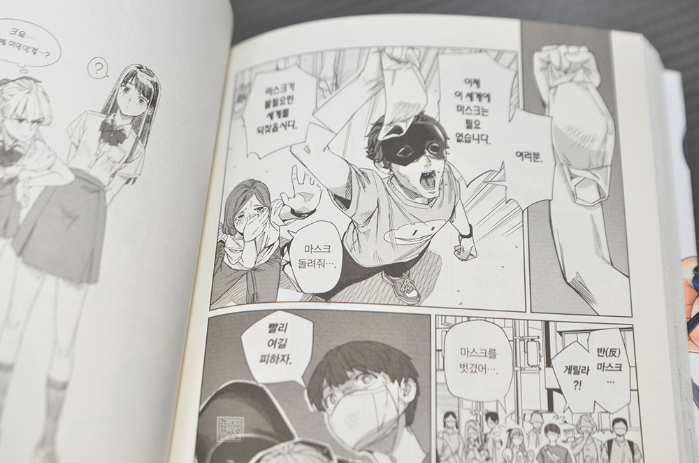 만화 <뉴노멀 1권>은 작품의 배경이 되어 있는 시대를 소개하면서 주인공 일행이 마스크 없이 살았던 부모님 세대의 일은 그저 '이야기로 들었을 뿐'이었다. 만화 1권을 본다면 여자 주인공 나츠키가 "위생 관리도 지금처럼 깐깐하지 않고. 마스크도 안 하고 다니고…."라고 말하는 장면이 있다. 이 장면은 곧 만화에서 그려지는 갈등의 요소이기도했다.