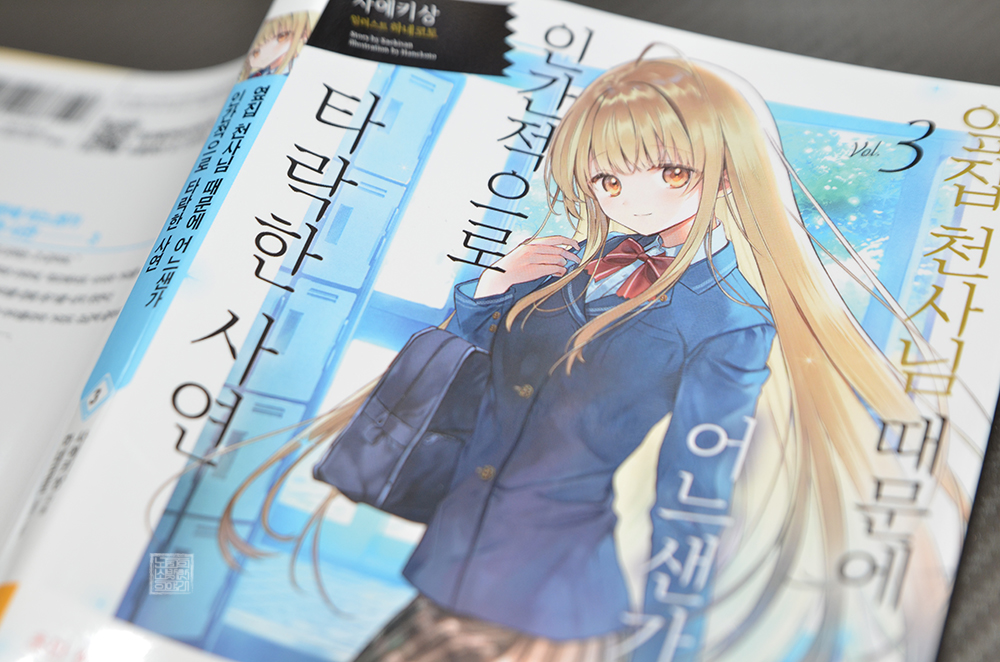 서로 사람에게 상처를 받은 아픔을 가지고 있는 아마네와 마히루 두 사람이 서로를 지탱하며 앞으로 나아갈 모습이 기대되었던 라이트 노벨 <옆집 천사님 때문에 어느샌가 인간적으로 타락한 사연 3권>. 3권 마지막에 수록된 마히루를 뒤에서 안는 아마네의 모습은 "크, 너무 최고야!!!"라는 감탄이 저절로 나왔으니, 꼭 책을 읽어보도록 하자.