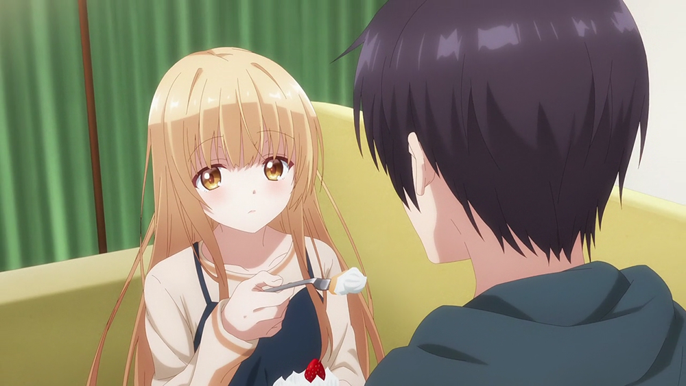 아마네의 어머니 시호코 덕분에 정신 없이 막을 올린 애니메이션 <옆집 천사님 때문에 인간적으로 타락한 사연 3화>는 시험에서 마히루가 학년 톱을 차지한 것을 축하하기 위해서 아마네가 딸기 케이크를 사 온 장면이 그려진다. 커다란 원을 이루는 케이크가 아니라 조각 케이크이기에 가능한 서로 케이크를 먹여주는 장면은 무척 보기 좋았다.