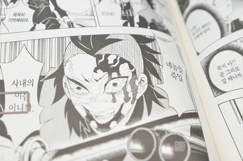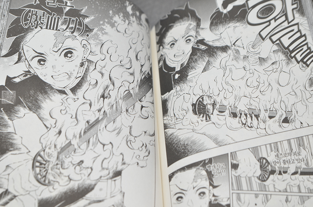 하지만 아무리 여러 장면을 교차해서 보여주더라도 우리가 만화 <귀멸의 칼날 13권>에서 가장 주목할 수밖에 없는 싸움은 주인공 카마도 탄지로의 싸움이다. 탄지로가 네즈코의 힘을 빌려서 붉게 불타는 혈도를 흉내 내며 히노카미 카구라를 쓰는 모습은 완전히 요리이치의 모습과 겹쳐지면서 그의 앞에선 오니들의 간담을 서늘하게 했다.