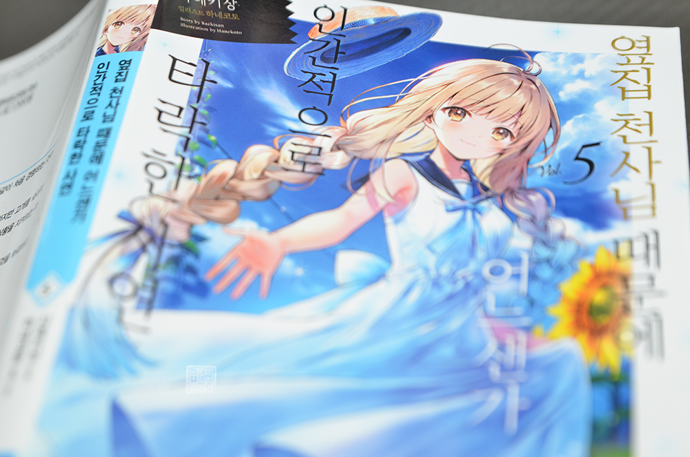 애니메이션으로 방영되면서 더욱 많은 사람의 사랑을 받고 있는 라이트 노벨 <옆집 천사님 때문에 어느샌가 인간적으로 타락한 사연> 시리즈의 제5권을 오늘 마침내 읽었다. 이번 라이트 노벨 5권은 표지에 그려진 일러스트부터 '와, 대박….'이라는 감탄이 저절로 나오는데, 하얀 원피스를 입고 있는 마히루의 모습은 정말 너무나 예뻤다.