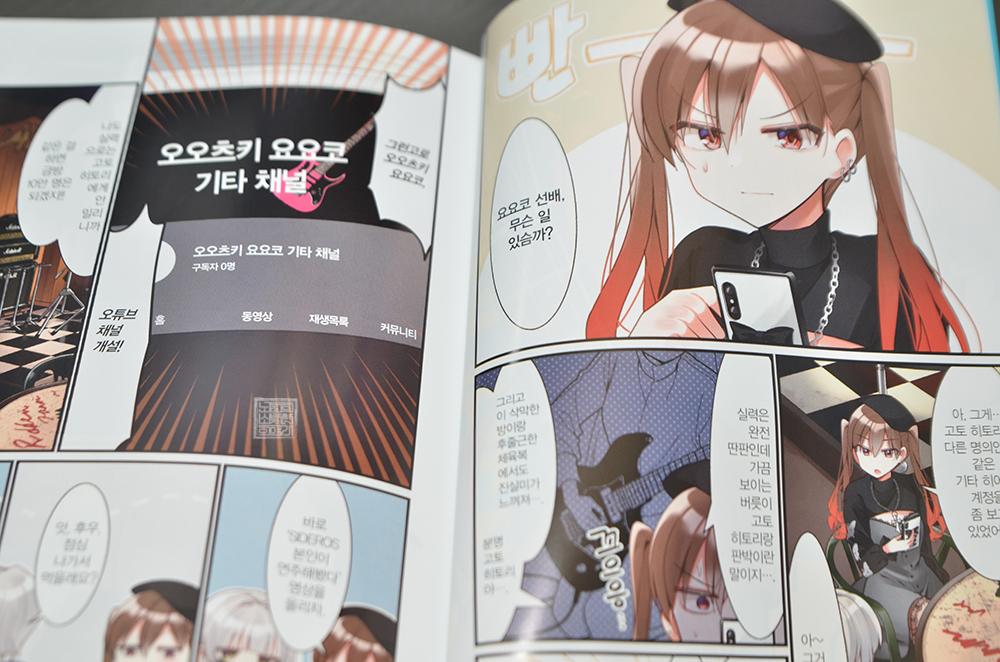 뭐, 그런 이야기는 제쳐두고 만화 <봇치 더 록 4권>의 이야기를 해보도록 하자. 이번 만화 4권의 표지를 넘기면 가장 먼저 읽어볼 수 있는 페이지는 컬러로 그려져 있다. 컬러 페이지에서 볼 수 있는 건 SIDEROS의 리더 오오츠키 요요코가 봇치의 기타 히어로에 대항하기 위해 유튜브 채널을 개설해 멤버들과 함께 유튜브 채널을 운영하는 모습이다.