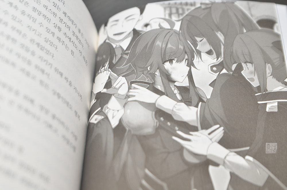 지난 2월을 맞아 발매된 라이트 노벨 <변변찮은 마술강사와 추상일지 9권>은 한시도 눈을 뗄 수 없는 본편의 전개에서 벗어나 잠시 가볍게 읽어볼 수 있는 단편이 실려 있다. 이번 추상일지 9권의 표지를 본다면 휠체어를 타고 있는 리엘을 보살피는 듯한 글렌(저 얼굴 뭐야)의 모습이 아주 따스한 분위기의 일러스트가 예쁘게 잘 그려져 있다.