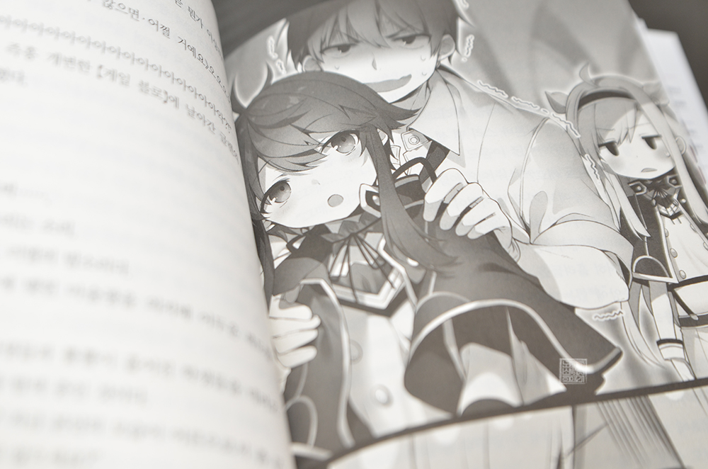 지난 2월을 맞아 발매된 라이트 노벨 <변변찮은 마술강사와 추상일지 9권>은 한시도 눈을 뗄 수 없는 본편의 전개에서 벗어나 잠시 가볍게 읽어볼 수 있는 단편이 실려 있다. 이번 추상일지 9권의 표지를 본다면 휠체어를 타고 있는 리엘을 보살피는 듯한 글렌(저 얼굴 뭐야)의 모습이 아주 따스한 분위기의 일러스트가 예쁘게 잘 그려져 있다.