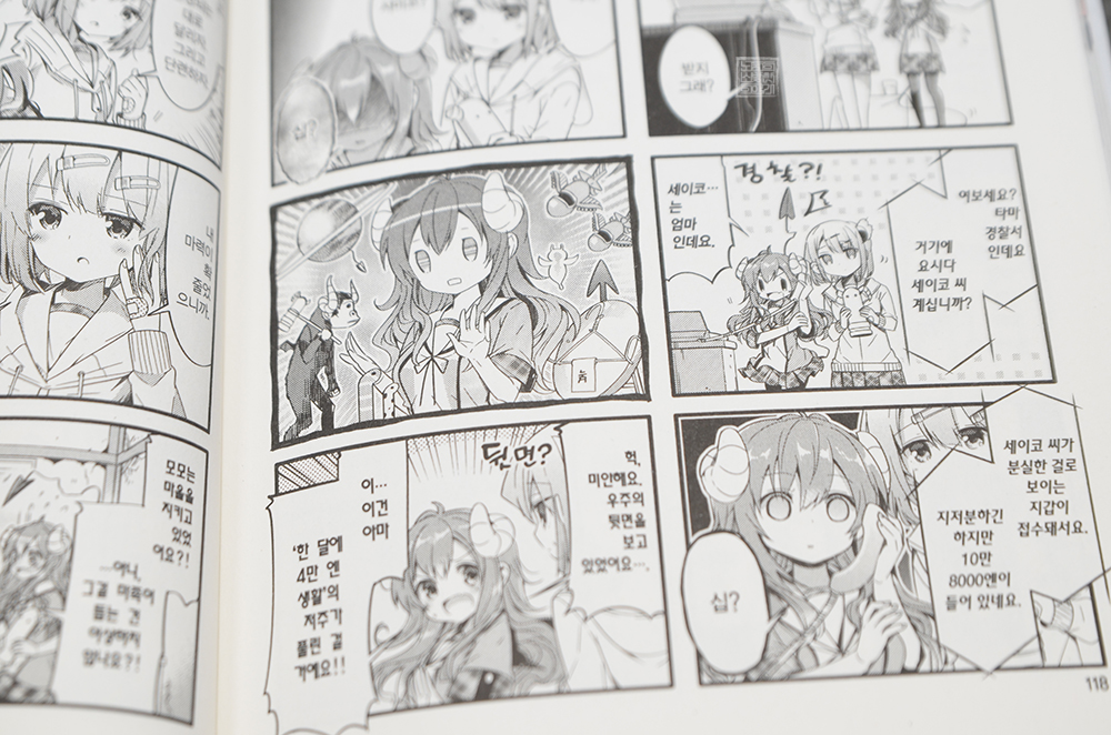 하지만 막상 책을 읽어보면 판타지 설정을 가지고 있어도 <마법소녀 마도카 마기카>처럼 꿈도 희망도 없는 그런 이야기가 아니라 귀여움과 사랑스러움이 가득한 일상물이었다. 만화 <길모퉁이 마족 1권>의 표지에서 볼 수 있는 마족 소녀 요시다 유코와 마법 소녀 치요다 모모 두 사람의 모습은 누가 보더라도 적이 아니라 평범한 친구사이다.