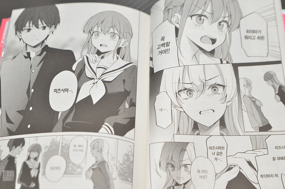 히야마가 키무라와 미즈시마 두 사람의 모습을 보면서 해버린 오해 때문에 벌어지는 작은 소동이 만화 <순정만화 주인공X라이벌 4권> 전반부의 핵심이다. 히야마가 멋대로 폭주하는 장면은 너무 귀여워서 웃음이 지어졌는데, 여기서 우리는 사람이 누군가에게 어떤 말을 하고자 한다면 주어와 목적어를 분명히 해야 한다는 걸 알 수 있었다.