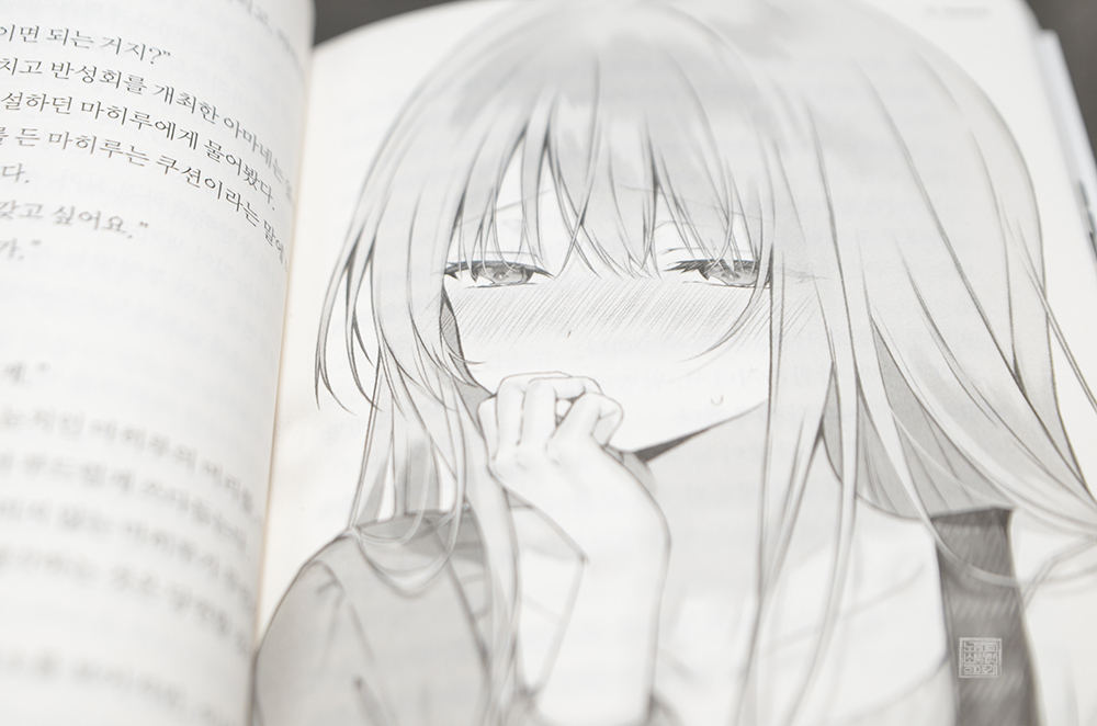 해당 장면이 그려진 페이지에는 위 사진에서 볼 수 있는 부끄러워 하지만 용기를 내서 자신의 욕심을 전하는 마히루의 일러스트가 너무나 귀엽게 잘 그려져 있다. 책을 읽고 나서 몇 장 넘기지 않은 상태에서 해당 장면을 마주했을 때 얼마나 웃었는지 모른다. 마히루의 모습이 너무 귀여운 데다가 글로 읽을 수 있는 묘사가 진짜 대박이었다.