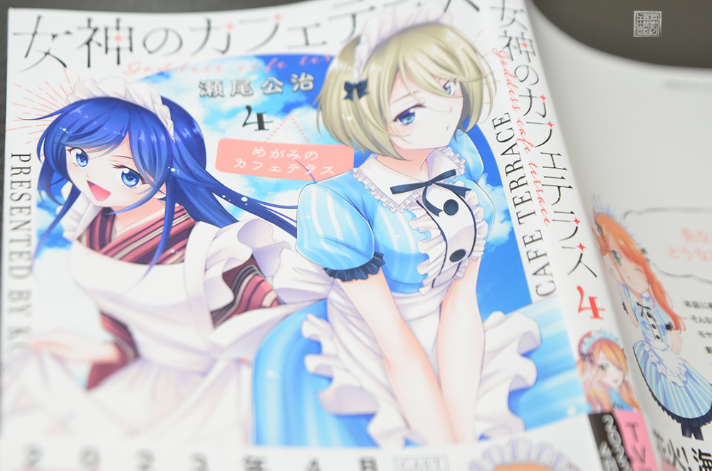 애니메이션 <여신의 카페테라스 1기>의 종착점이 될 것으로 예상하는 만화 <여신의 카페테라스 4권>은 애니메이션 9화에서 그려진 장면으로 막을 올린다. 애니메이션 9화에서 그려진 리호가 과거 방송 활동을 하면서 인연을 맺은 AD와 이야기를 나누는 장면은 3권에서 그려졌는데, 이는 애니메이션이 이야기의 배치를 바꾸었기 때문이다.