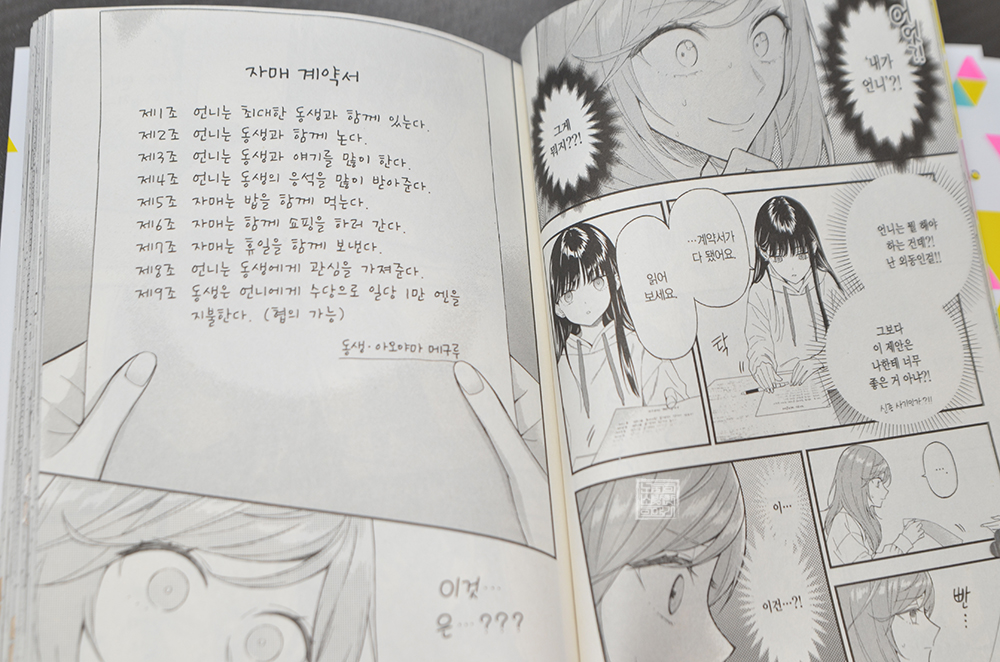 대원씨아이에서 발매가 되고 있던 만화 <순정만화 주인공X라이벌>이 완결을 맺은 이후 또 달리 읽어볼 만한 백합물을 그리는 만화가 발매되었다. 그 만화는 위 사진에서 볼 수 있는 만화 <계약 자매 1권>으로, 제목에서 볼 수 있듯이 표지에 그려진 두 사람은 진짜 자매가 아니라 계약을 통해서 자매로 지내면서 거리를 좁히는 사이다.