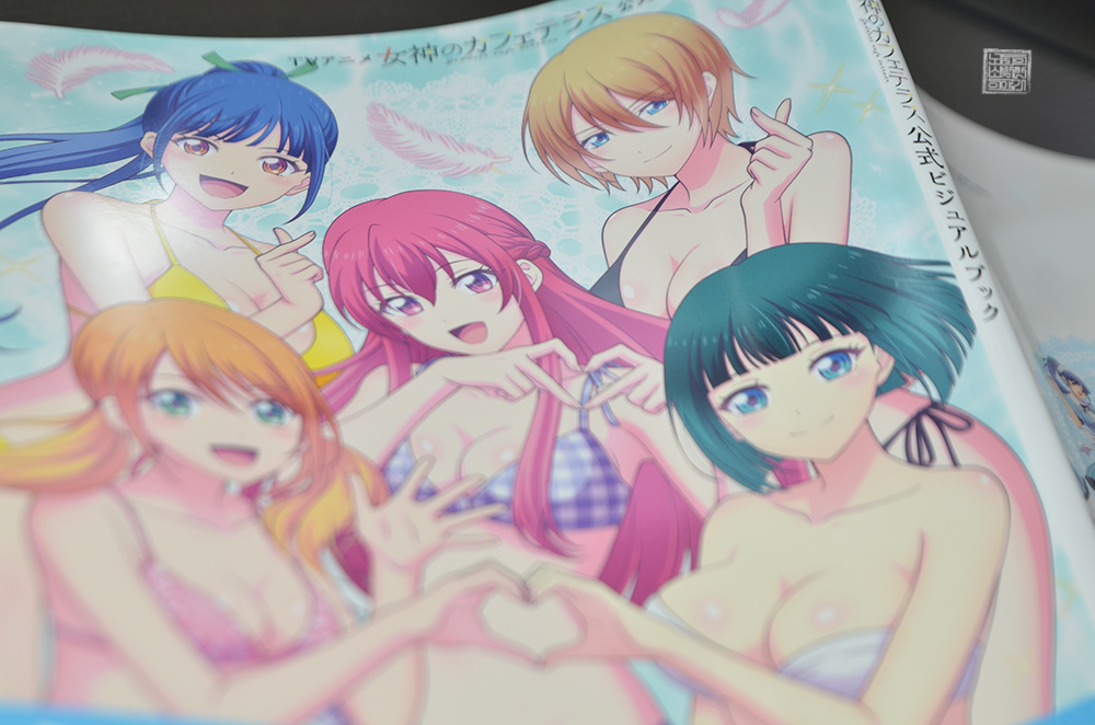책을 펼치면 가장 먼저 볼 수 있는 건 <여신의 카페테라스>에서 등장하는 히로인들이 그려진 양면 컬러 일러스트 페이지 두 장이다. 해당 페이지에서 볼 수 있는 애니메이션 작화로 그려진 히로인들의 모습과 만화 작화로 그려진 히로인들의 모습은 모두 다 훌륭했는데, 기회만 된다면 모두가 수영복을 입는 모습은 B2 태피스트리로 갖고 싶었다.