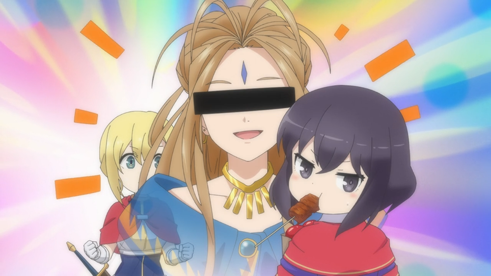 애니메이션 <포션빨로 연명합니다 5화>는 카오루가 앞으로 자신의 포션을 어떻게 보급할지 고민하는 와중에 기사 프란세트를 만나는 모습으로 막을 올린다. 이때 프란세트가 "여신님!"이라고 외치는 모습을 카오루가 <오! 나의 여신님>을 빗대어 애써 무시하는 모습을 볼 수 있었는데, 이런 장면도 애니메이션은 원작 그대로 그려졌다.