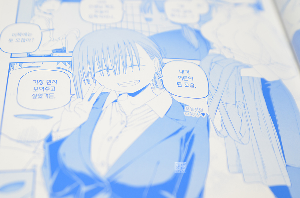 '거의 여고생'인 앞머리 짱이 보여주는 갭 모에와 귀여움은 만화를 읽는 내내 "귀, 귀여워!!"라는 감탄이 저절로 나올 수밖에 없다. 그런 히로인과 맺어져서 행복한 시간을 보내는 선생님은 비록 박봉이라고 해도 하루하루가 행복할 수 있다고 생각한다. 만화 <월요일의 타와와 4권>에서 볼 수 있는 앞머리 짱도 정말 최고였다.