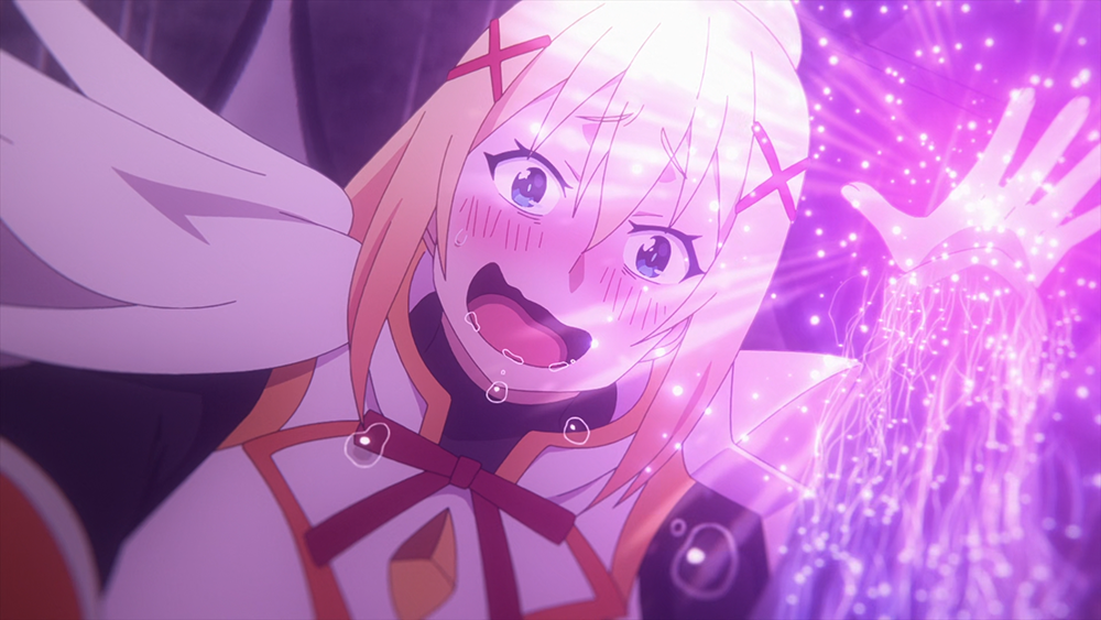 모든 것이 해피 엔딩으로 끝나면서 더는 일이 없을 것 같았던 <이 멋진 세계에 축복을 3기 8화>이었지만, 지난 7화부터 계속 이상한 모습을 보여주었던 다크니스는 이번 히드라 토벌과 토벌 축하 파티가 끝난 이후 자취를 감춘다. 그녀가 남긴 편지를 본다면 무언가 말할 수 없는 사정이 있어 보였는데… 도대체 무슨 사정일까?