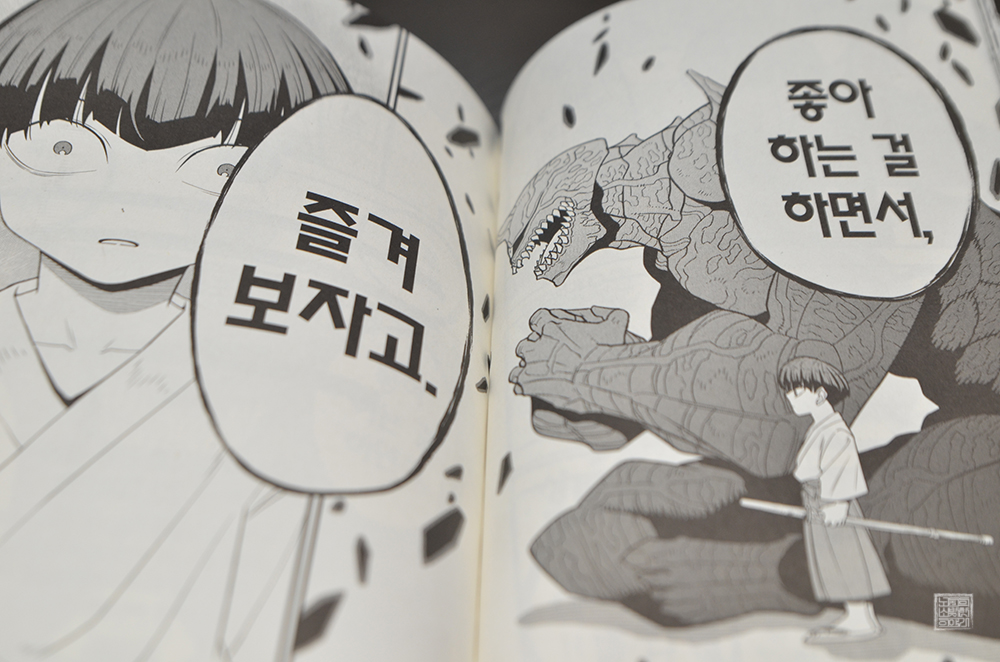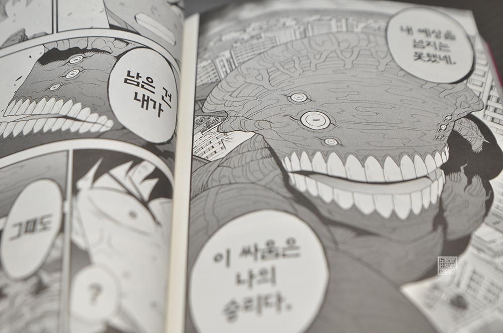 책을 읽는 데에는 불과 몇 분밖에 걸리지 않았지만, 아마 만화 <괴수 8호 12권>에서 호시나의 전투가 그려진 페이지를 넘길 때의 도파민 혹은 아드레날린 수치는 최대치를 기록했을 것으로 생각한다. 우리가 <괴수 8호>라는 작품에서 기대하는 것은 다른 이야기가 아니라 이렇게 주인공과 그 일행이 강한 괴수와 벌이는 치열한 싸움이었다.