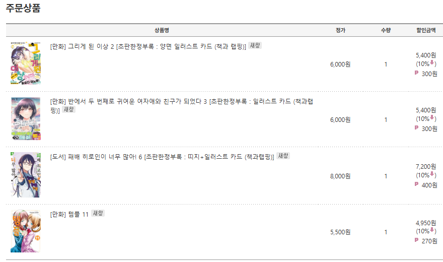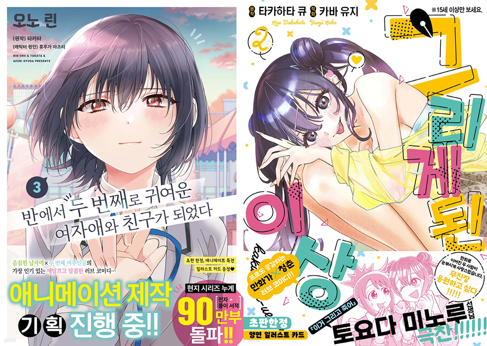 그리고 이번 11월을 맞아 구매할 계획은 없었지만, 개인적으로 애타게 기다리고 있던 러브 코미디 만화 두 개가 예약 판매를 시작했기 때문에 바로 카트에 담은 이후 오늘 결제했다. 그 만화는 (주)조은세상에서 국내에 정식 발매하고 있는 만화 <반에서 두 번째로 귀여운 여자애와 친구가 되었다 3권>과 <그리게 된 이상 2권> 두 권이다.