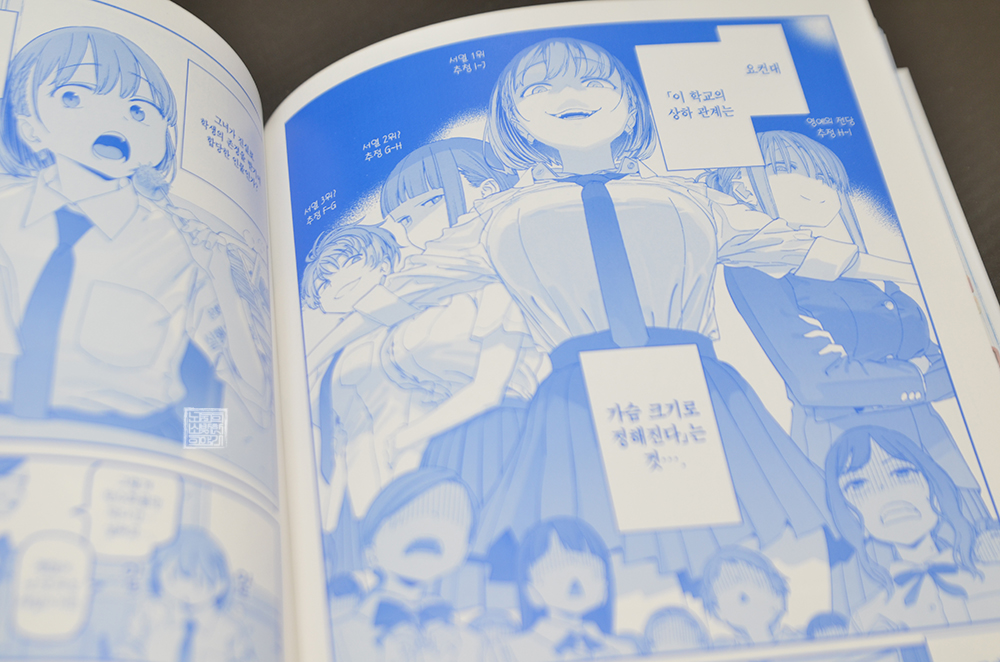 아이를 비롯해 아이 앞에 학생회장으로 근무했던 앞머리 짱이 보여주는 모습도 여기서 잘 그려져 있었지만, 확실히 그녀들의 관계를 본다면 가슴 크기로 정해지나고 말해도 과언이 아니었다. 서열 1위의 아이 짱이 추정 I컵인 데다가 2위 무녀짱이 추정 G-H컵이라는 것도 재밌었다. 이런 몸매를 실제로 본다면 얼마니 대단할까?