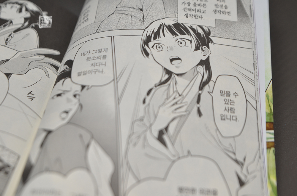 일본 내에서도 어쩌다 보니 그렇게 발매되었던 만화이다 보니 국내에서도 만화는 두 종류가 하나는 서울미디어코믹스, 또 다른 하나는 학산문화사를 통해 발매되고 있다. 오늘 여기서 소개할 만화 <약사의 혼잣말 14권>은 학산문화사를 통해 국내에서 정식 발매 중인 만화로, 조금 더 마오마오의 모습을 귀엽게 볼 수 있었다.