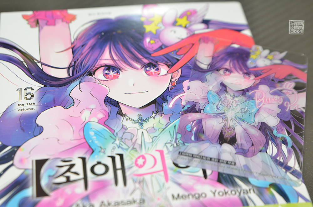 많은 사람이 기다렸을, 혹은 기다리지 않았을 만화 <최애의 아이> 시리즈의 최종권이 오는 2025년 6월을 맞아 한국에 정식 발매되었다. 첨부한 사진에서 볼 수 있는 만화 <최애의 아이 16권> 표지를 보면 호시노 아이의 모습이 정말 예쁘게 잘 그려져 있는데, 만화 16권은 일반판만 아니라 여러 특전을 받을 수 있는 특별판도 함께 발매되었다.