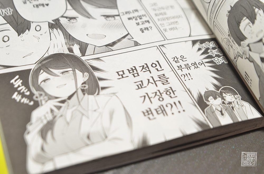 오늘도 여전히 매력적인 히요리의 일러스트가 그려진 만화 <비실비실 선생님 8권>은 히요리와 아비쿠라 두 사람이 창고에서 어쩌다 보니 얽힌 모습을 보건실 선생님에게 들킨 모습으로 막을 올린다. 누가 보더라도 두 사람이 그런 일을 하고 있었다고 오해할 수도 있는 장면에서 츠루마키 선생님은 당연히 그런 오해를 한다.