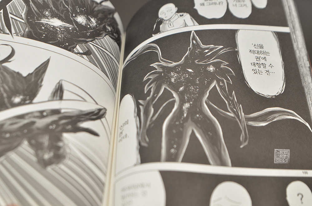 바로, 괴수의 왕이자 신이라고 말하는 이와의 접촉이었다. 그로 인해 가로우는 우리가 만화 <원펀맨 33권>의 표지에서 볼 수 있는 새로운 형태로 변하게 되었다. 흑백 페이지만 읽어 보았을 때는 가로우의 몸이 발산하는 빛이 무엇인지 정확히 이해하기 어려웠는데, 컬러 일러스트 덕분에 그것이 우주와 은하라는 것을 분명히 알 수 있었다.
